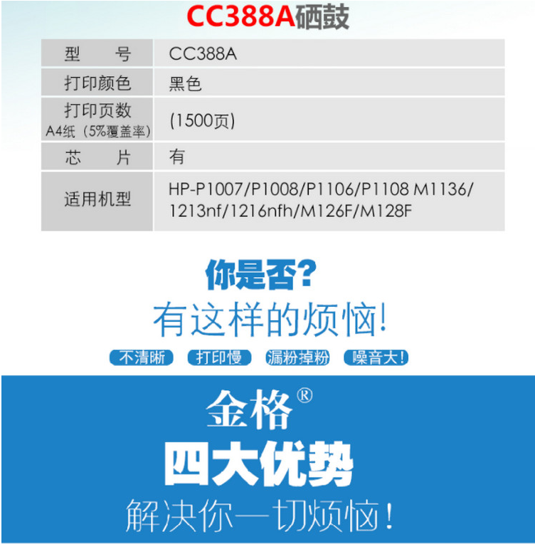 金格 CC388A硒鼓 適用惠普M1136 P1007 P1008 P1106 P1108 M1216nfh M126a nw M226dw dn M128fw fp M202n